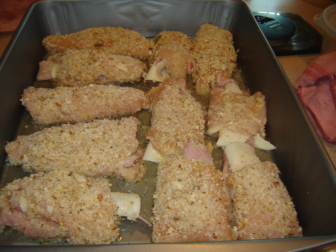 1. Lay Chicken Cutlets flat and put ham, cheese, onions, mushroom and gravy on top |
